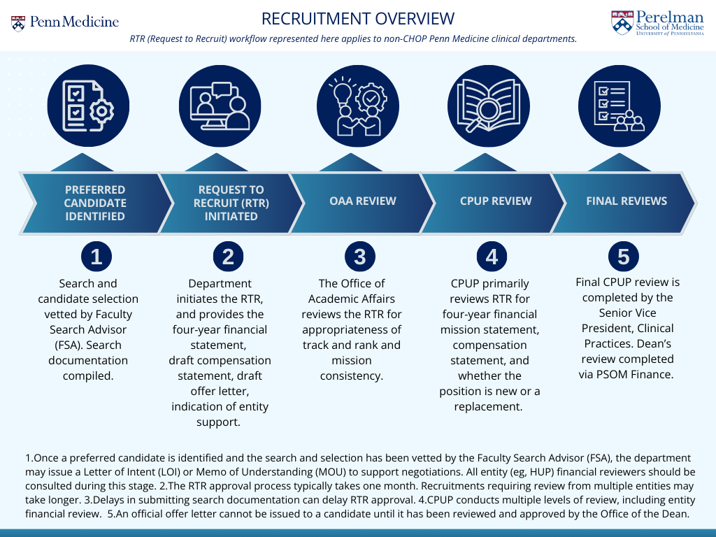 - An offer letter may not be sent to candidates for Full-time Faculty, Academic Clinician Part-time, Penn Medicine Clinician, or Academic Support Staff recruitments until a RTR is reviewed and approved by the Office of the Dean.